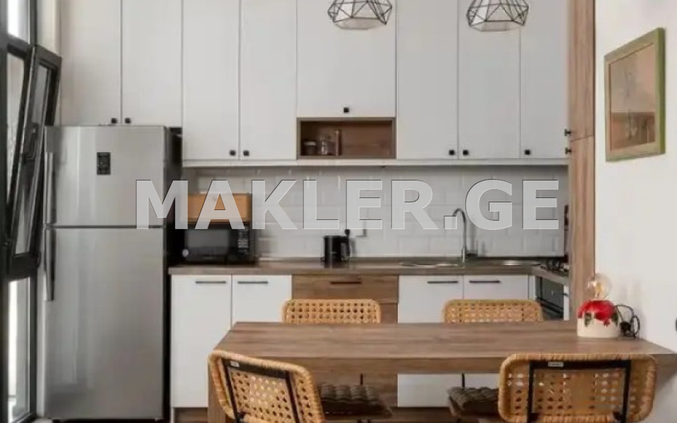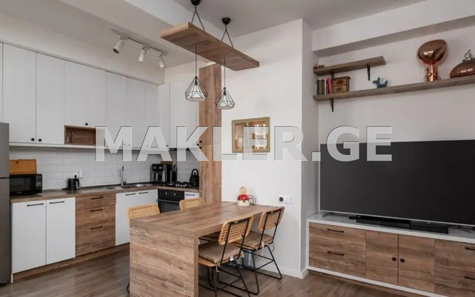 شقة زاوية للبيع بمساحة 85 مترًا مربعًا، تضم غرفتي نوم وحمامًا واحدًا وغرفة معيشة واسعة وشرفة كبيرة مطلة على مدينة تبليسي وشرفة صغيرة. يتميز المبنى بفناء خاص مزود بملعب كرة قدم وأراجيح، بالإضافة إلى مصعدين وخدمات أمن واستقبال.