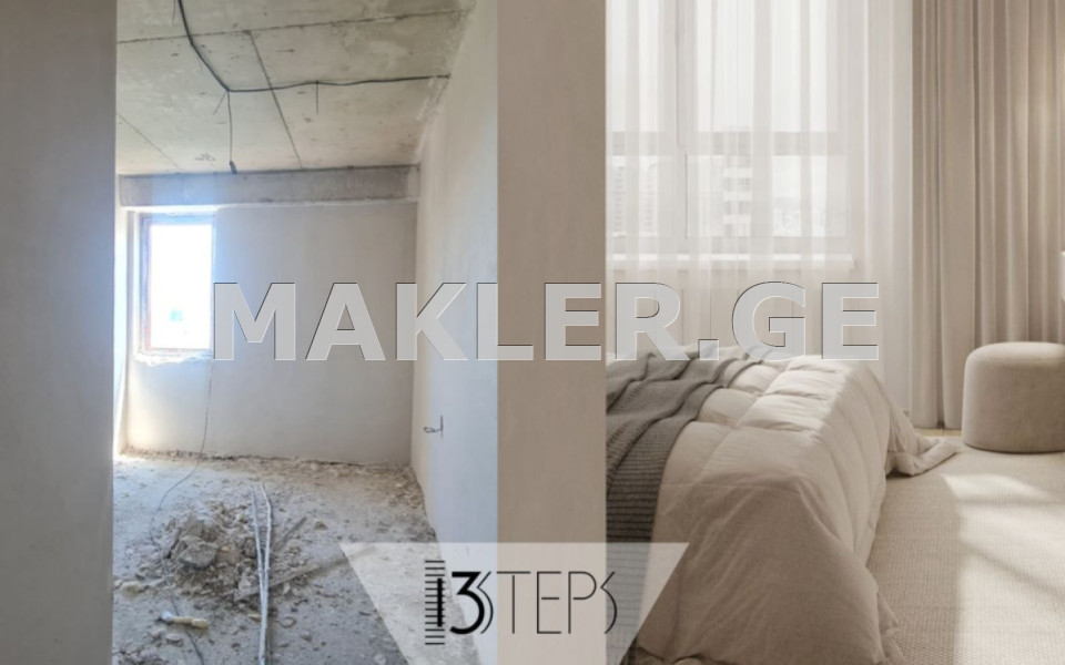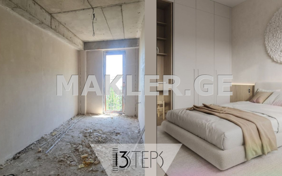 ბინა ბარდება მწვანე კარკასის მდგომარეობით. 43 კვ.მ. სივრცე გონივრულადაა განაწილებული. ბინა არის კუთხის და ნათელი. აქვს აივანი, საიდანაც იშლება ულამაზესი ხედი მთაწმინდაზე.