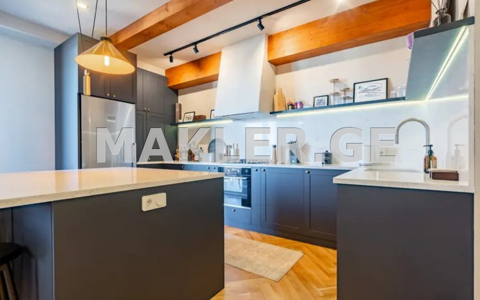 ბინაში განთავსებულია ორი საძინებელი, მათ შორის ერთი მასტერ-საძინებელი საკუთარი სველი წერტილითა და გარდერობით. ბინა სრულად არის აღჭურვილი ყველა საჭირო ტექნიკითა და ავეჯით, მათ შორის Boston Acoustics-ის აუდიო სისტემით ჩაშენებული დინამიკებით, ნატურალური მუხის მასიური ავეჯით და კომფორტული ცხოვრებისთვის აუცილებელი ყველაფრით. მოწყობილია ცალკე სამრეცხაო/სათავსო ოთახი, რომელიც აღჭურვილია AEG-ის საშრობი და სარეცხი მანქანებით. იატაკები მოპირკეთებულია ნატურალური მუხის პარკეტით, ხოლო ყველა შიდა კარი აღჭურვილია იტალიური საკეტებითა და სახელურებით.