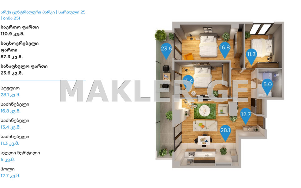 იყიდება 4 ოთახიანი ბინა არქის პრემიუმ კლასის საცხოვრებელ კომპლექსში - არქი ცენტრალური პარკი.