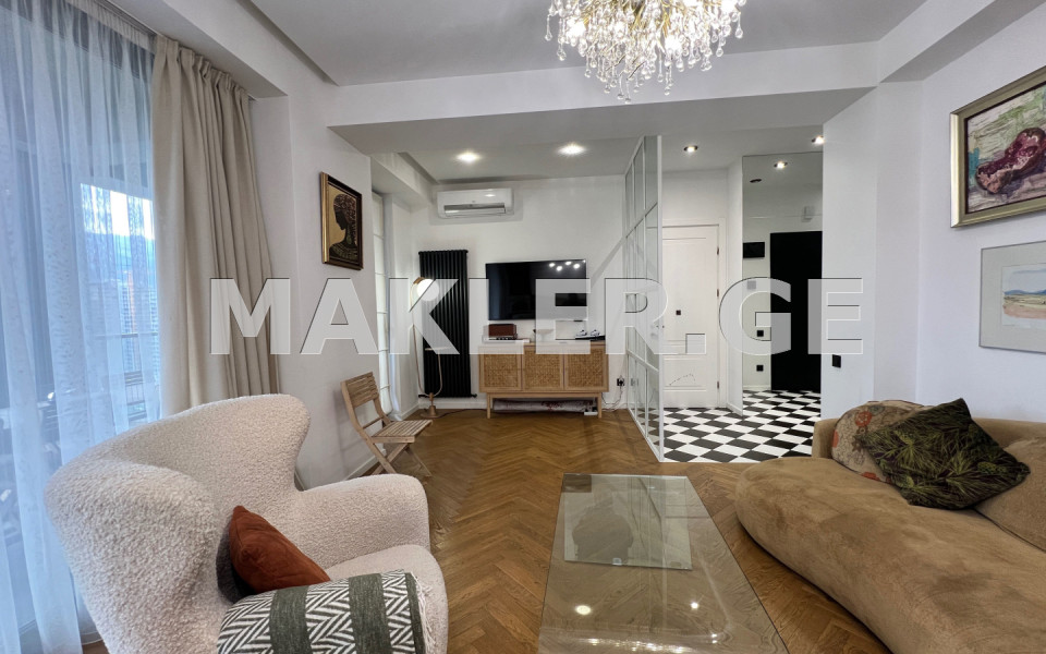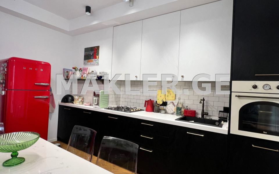 ბინა არის უნიკალური დიზაინის, მუხის ევროპული პარკეტით, სამზარეულოში ტეკას ტექნიკითა და სმეგის გამორჩრული მაცივრით.