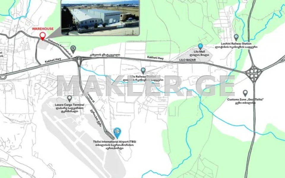 ქირავდება 600კვ.მ. სასაწყობე ფართი თავისი ოფისით, 12 მეტრიანი სიმაღლის ჭერით, A კლასის ახალაშენებული სასაწყობე შენობაში რომელიც მდებარეობს თბილისში, დიდ ლილოში, აეროპორტის გადასახვევთან, კახეთის გზატკეცილიდან 900 მეტრში.