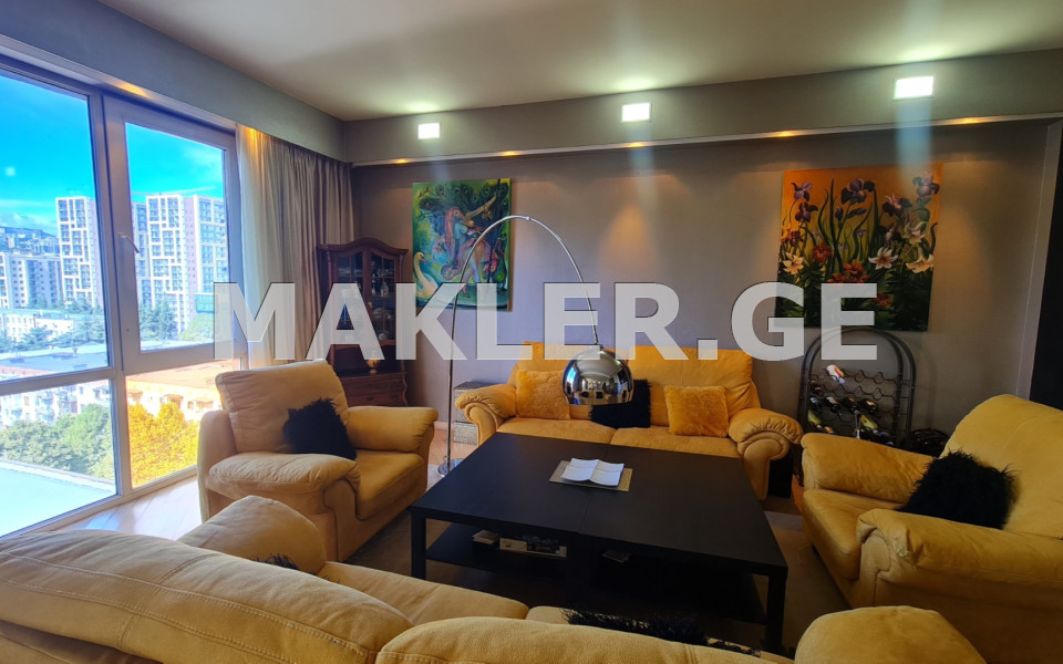 Продаётся 5-комнатная квартира дуплексного типа, светлая и просторная, в самом центре Сабуртало, на пересечении улиц Мицкевича и Казбеги. В квартире 3 изолированные спальни со своими санузлами, гостевой санузел, кабинет с камином, большая гостиная и 2 кладовые. Все комнаты имеют выход на балкон (всего четыре балкона), а кухня примыкает к веранде. В гостиной есть барная стойка, где также проведена вода и установлена мойка. В квартире большая прихожая, встроенные шкафы и зона для занятий спортом. В стоимость включены 2 парковочных места в закрытом дворе.
